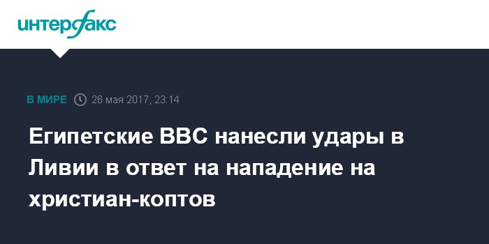 Москва. 26 мая. INTERFAX.RU - Самолеты ВВС Египта в пятницу нанесли удары по базам экстремистов на востоке Ливии, сообщает агентство "Ассошиэйтед пресс" со ссылкой на египетских официальных лиц. Удары стали ответом на организованное террористами нападение в Египте на христиан-коптов, отмечается в сообщении.
