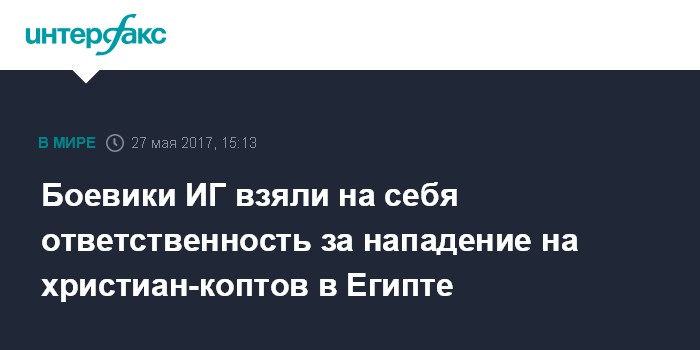Москва. 27 мая. INTERFAX.RU - Боевики "Исламского государства" (ИГ, запрещенная в России группировка) в субботу распространили заявление, в котором взяли на себя ответственность за нападение на христиан-коптов в Египте, сообщает арабская пресса.
