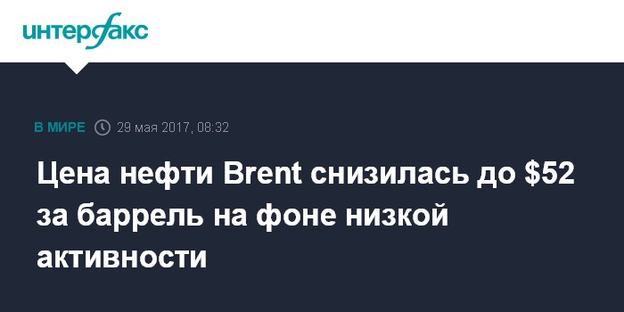 Цена нефти Brent снизилась до $52 за баррель на фоне низкой активности