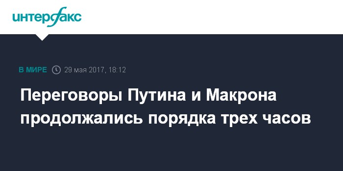 Москва. 29 мая. INTERFAX.RU - Переговоры президентов РФ Владимира Путина и Франции Эммануэля Макрона продолжались порядка трех часов.