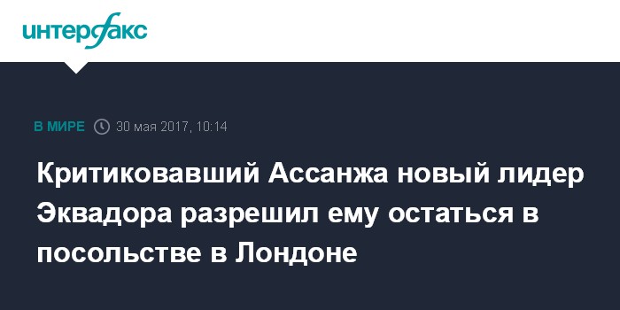 Москва. 30 мая. INTERFAX.RU - Президент Эквадора Ленин Морено назвал основателя ресурса WikiLeaks Джулиана Ассанжа хакером, но позволил ему остаться в посольстве страны в Лондоне, сообщают во вторник западные СМИ.