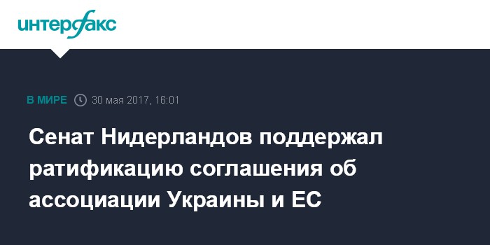 Москва. 30 мая. INTERFAX.RU - Верхняя палата парламента Нидерландов (Сенат) поддержала ратификацию Соглашения об ассоциации между Украиной и Европейским союзом. Голландские парламентарии проголосовали за ратификацию этого документа на заседании 30 мая.