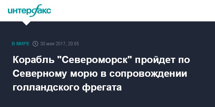 Москва. 30 мая. INTERFAX.RU - Большой противолодочный корабль "Североморск" после прохождения во вторник пролива Ла-Манш в настоящее время идет по Северному морю в сопровождении фрегата ВМС Нидерландов. Об этом сообщил капитан голландского корабля, опубликовавший в своем твиттере фотографию "Севроморска".