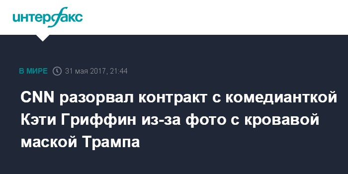 Москва. 31 мая. INTERFAX.RU - Американской комедиантке Кэти Гриффин отказано в ведении традиционного новогоднего шоу на телеканале CNN после публикации фотографии, на которой она держит в руке окровавленную маску президента США Дональда Трампа.