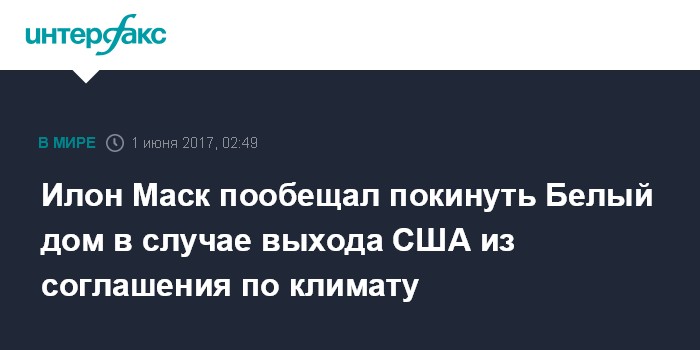 Москва. 1 июня. INTERFAX.RU - Глава Space X и Tesla Motors Илон Маск в среду заявил, что оставит свои должности в Белом доме, если США выйдут из парижского соглашения о климате.