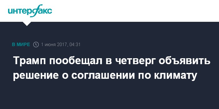 Москва. 1 июня. INTERFAX.RU - Президент США Дональд Трамп объявит о своем решении относительно Парижского соглашения по климату в четверг вечером по московскому времени.