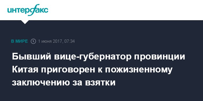 Бывший вице-губернатор провинции Китая приговорен к пожизненному заключению за взятки