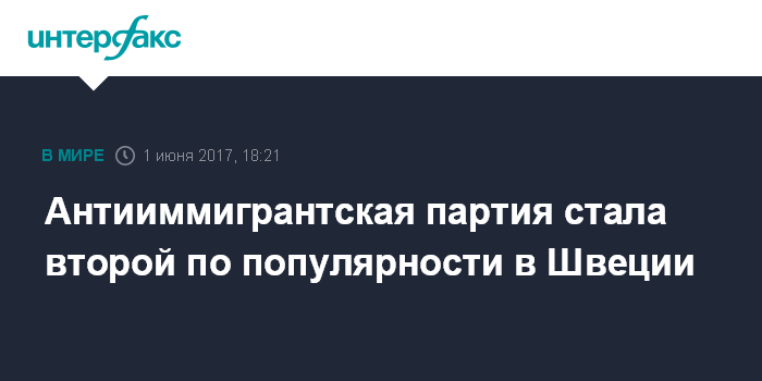 Москва. 1 июня. INTERFAX.RU - Партия "Шведские демократы", выступающая против иммиграции, стала второй по популярности в стране, сообщил в четверг ресурс Local со ссылкой на результаты опроса крупнейшего в Швеции статистического агентства SBC.