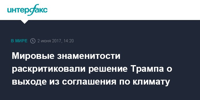 Москва. 2 июня. INTERFAX.RU - Многие голливудские звезды, музыканты и другие известные деятели неодобрительно отреагировали на решение президента США Дональда Трампа вывести страну из парижского соглашения по климату.