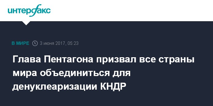 Москва. 3 июня. INTERFAX.RU - Министр обороны США Джеймс Мэттис призвал все страны мира к сотрудничеству для обеспечения денуклеаризации Северной Кореи, действия которой, по его словам, представляют всеобщую угрозу.