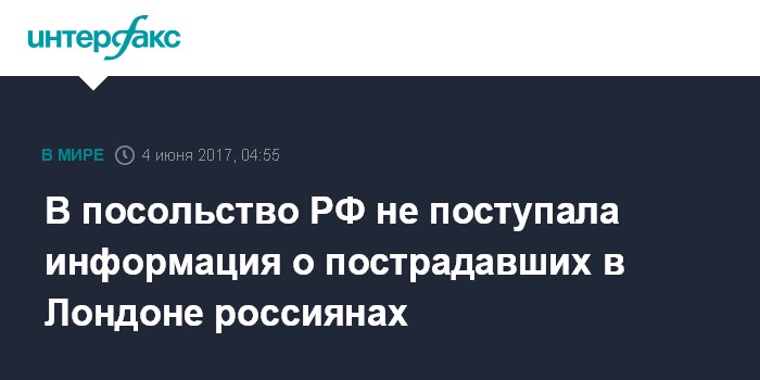 Москва. 4 июня. INTERFAX.RU - В посольство РФ в Великобритании не поступало информации о пострадавших в ходе терактов в Лондоне россиянах, сообщили "Интерфаксу" в воскресенье в российской дипломатической миссии в Лондоне.