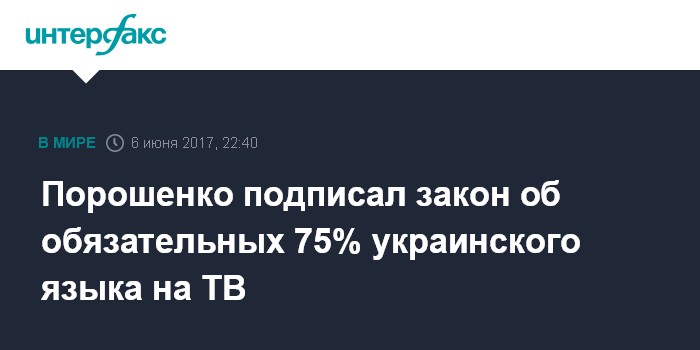 Москва. 6 июня. INTERFAX.RU - Президент Украины Петр Порошенко сообщил, что подписал закон, который устанавливает обязательную долю украиноязычного контента на телевидении в объеме 75% от общего объема.
