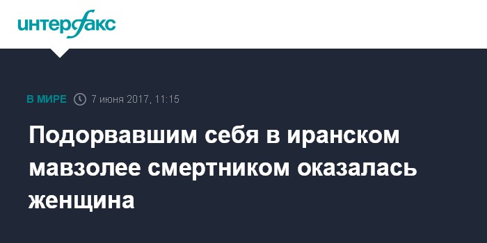 Москва. 7 июня. INTERFAX.RU - Террористом-смертником - одним из группы напавших на мавзолей имама Хомейни на юге Тегерана - оказалась женщина, сообщает иранское агентство "Мехр".