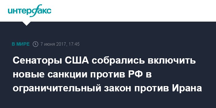 Москва. 7 июня. INTERFAX.RU - Американские сенаторы планируют попытаться ввести дополнительные санкции против России, включив их в закон об ограничительных мерах против Ирана, сообщает в среду издание The Hill.