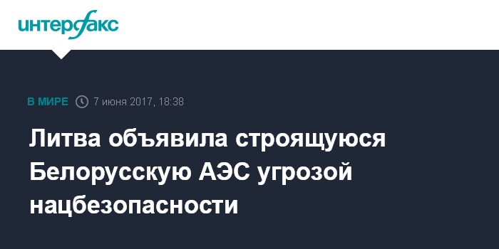 Москва. 7 июня. INTERFAX.RU - Кабинет министров Литвы решил, что строящаяся примерно в 50 километрах от Вильнюса (в белорусском Островце) Белорусская АЭС (БелАЭС) представляет угрозу национальной безопасности Литвы.