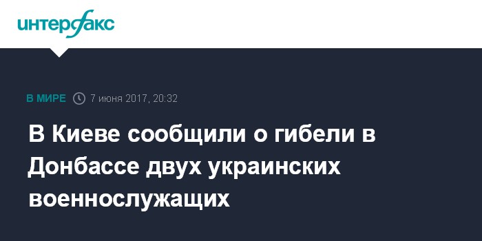 Москва. 7 июня. INTERFAX.RU - Двое украинских военнослужащих погибли и еще 11 получили ранения в зоне боевых действий в Донбассе с полуночи среды, сообщает штаб силовой операции, проводимой Киевом на востоке Украины.
