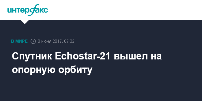 Москва. 8 июня. INTERFAX.RU - Американский спутник Echostar-21, стартовавший с Байконура, вышел на опорную орбиту.