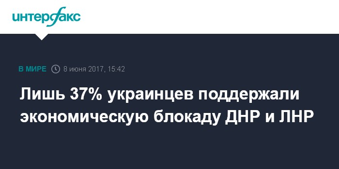 Москва. 8 июня. INTERFAX.RU - Примерно 37% украинцев не поддерживают экономическую блокаду неподконтрольных Киеву районов Донецкой и Луганской областей, свидетельствуют исследования "Динамика общественно-политических взглядов в Украине", проведенные с 21 апреля по 5 мая социологической группой "Рейтинг".