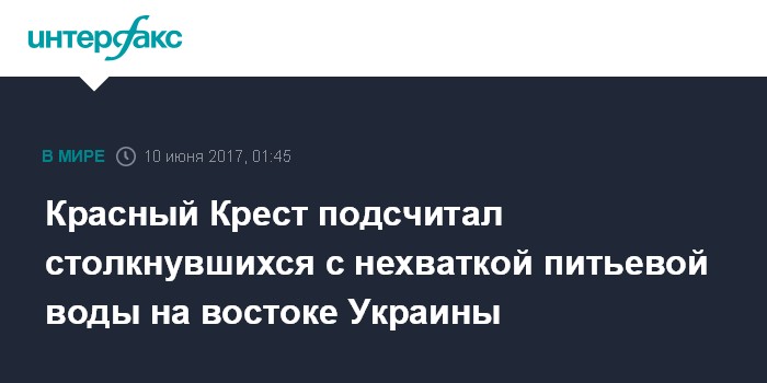 Москва. 10 июня. INTERFAX.RU - В Международном комитете Красного Креста (МККК) отмечают, что из-за эскалации боевых действий в Донбассе под постоянным риском остаться без водоснабжения находится от 350 тыс. до 800 тыс. местных жителей.