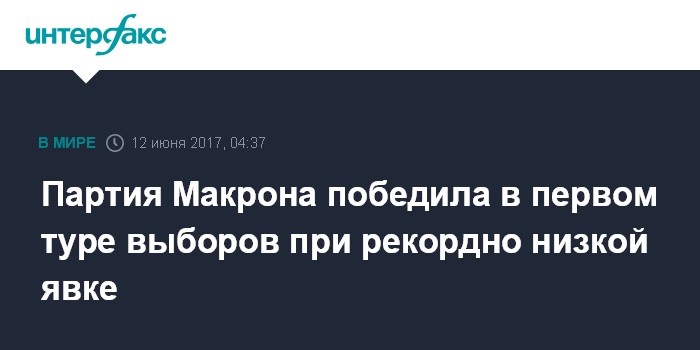 Москва. 12 июня. INTERFAX.RU - Партия "Вперед, республика" президента Франции Эмманюэля Макрона уверенно лидирует по итогам первого тура голосования на выборах в парламент, свидетельствуют окончательные данные МВД страны.