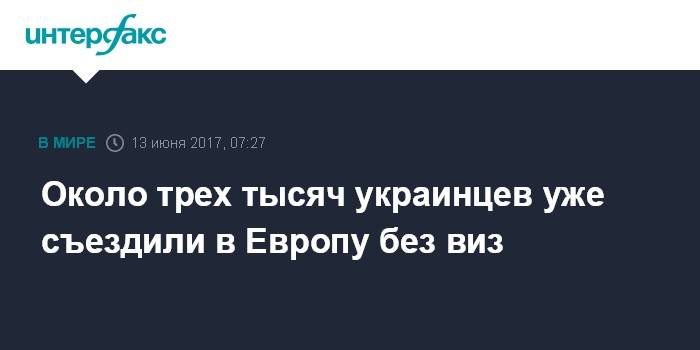 Москва. 13 июня. INTERFAX.RU - Безвизовым режимом с Европой, по состоянию на утро вторника, воспользовалось 2910 граждан Украины, сообщил спикер Государственной пограничной службы Украины Олег Слободян.