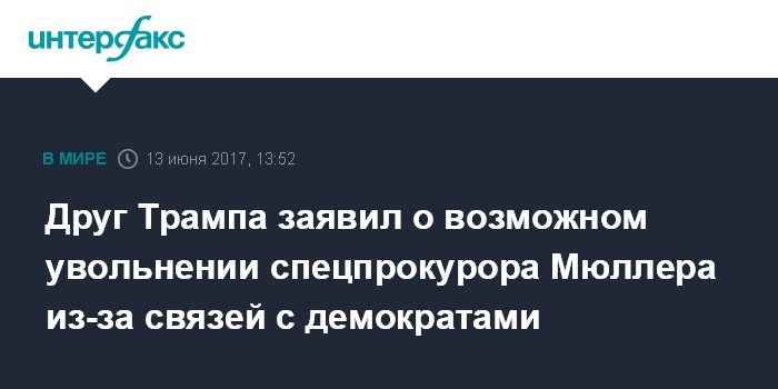 Москва. 13 июня. INTERFAX.RU - Президент США Дональд Трамп, вероятно, может уволить Роберта Мюллера с поста спецпрокурора, заявил во вторник генеральный директор Newsmax и близкий друг американского лидера Кристофер Рудди.