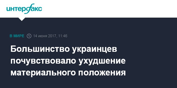 Москва. 14 июня. INTERFAX.RU - Почти две трети украинцев (60%) утверждают, что за последний год их материальное положение ухудшилось, почти у трети (30%) оно не изменилось и у 6% - улучшилось, свидетельствуют результаты опроса, проведенного социологической группой "Рейтинг".