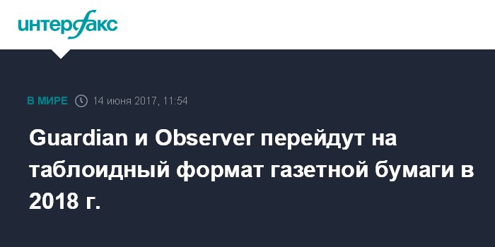Москва. 14 июня. INTERFAX.RU - Британские газеты The Guardian и The Observer в начале 2018 года перейдут на таблоидный стиль. Об этом сообщило издательство Guardian Media Group.