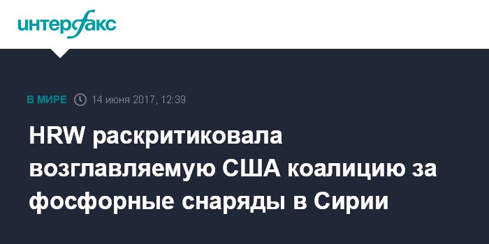 Москва. 14 июня. INTERFAX.RU - Правозащитная организация Human Rights Watch выступила с критикой в адрес возглавляемой США коалиции, которая проводит военную операцию в Сирии.