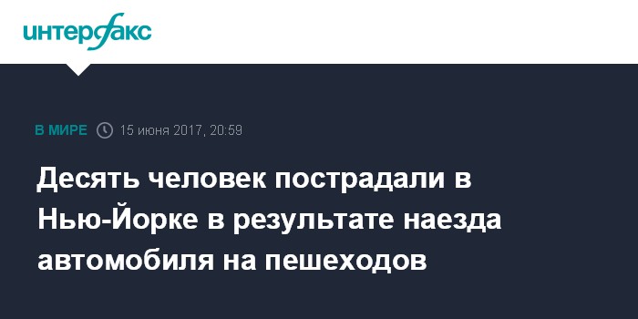 Москва. 15 июня. INTERFAX.RU - Десять пешеходов получили в четверг травмы в Нью-Йорке после того, как автомобиль вылетел с проезжей части на тротуар, сообщают американские СМИ.