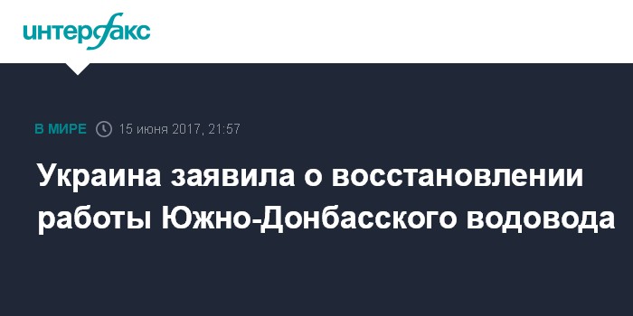 Москва. 15 июня. INTERFAX.RU - Южно-Донбасский водовод, работа которого ранее была нарушена вследствие обстрела, в четверг восстановил работу после восстановительных мер. Об этом сообщает украинская сторона Совместного центра по координации и контролю (СЦКК).