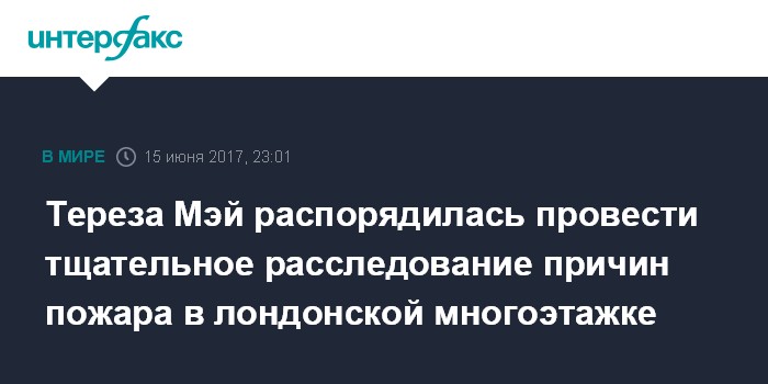 Москва. 15 июня. INTERFAX.RU - Премьер-министр Великобритании Тереза Мэй распорядилась провести всеобъемлющее расследование пожара в лондонской высотке, сообщает в четверг телерадиокорпорация "Би-би-си".