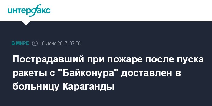 Москва. 16 июня. INTERFAX.RU - Сотрудник Военно-промышленной корпорации "НПО машиностроения" Вячеслав Тыц, получивший ожоги во время степного пожара, возникшего при падении блоков ракеты "Союз 2-1а", доставлен в Караганду, сообщили в пятницу агентству "Интерфакс" в областном управления здравоохранения.