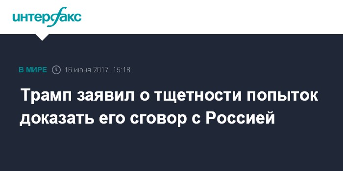 Москва. 16 июня. INTERFAX.RU - Президент США Дональд Трамп констатировал, что многочисленные расследования предполагаемого сговора во время американской предвыборной кампании между его окружением и Россией не привели к обнаружению доказательств.