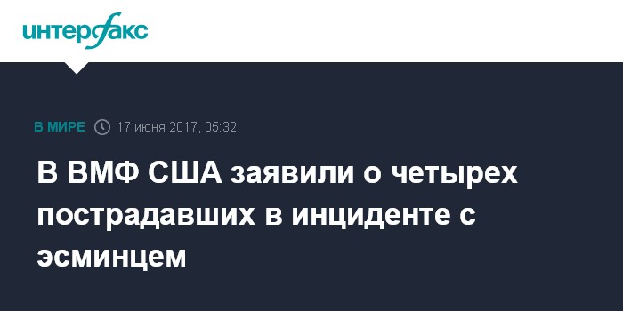 Москва. 17 июня. INTERFAX.RU - Представитель ВМФ США подтвердил, что четыре моряка получили травмы и семь - пропали без вести при столкновении эсминца Fitzjerald с торговым судном у берегов Японии. Как сообщает Fox News, один из пострадавших - капитан корабля.