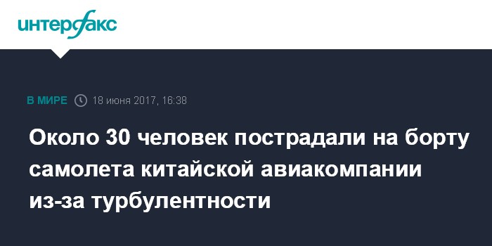 Москва. 18 июня. INTERFAX.RU - Не менее 26 человек получили травмы в воскресенье на борту лайнера China Eastern Airlines, который попал в зону турбулентности на маршруте Париж - Куньмин.