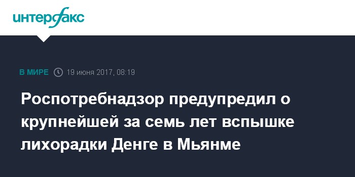Москва. 19 июня. INTERFAX.RU - В Мьянме зафиксирована крупнейшая вспышка лихорадки Денге за последние семь лет, болезнь унесла жизни восьми человек, сообщает пресс-служба Роспотребнадзора со ссылкой на данные Минздрава страны.