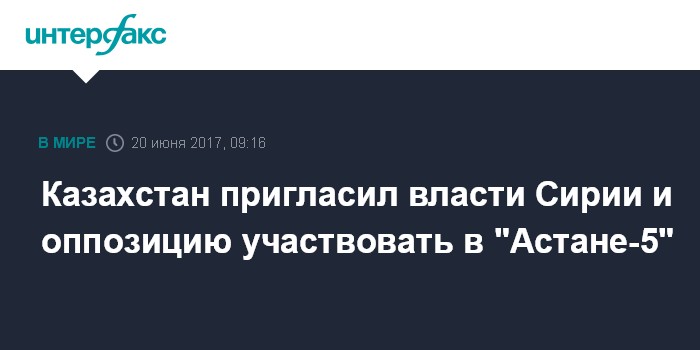 Москва. 20 июня. INTERFAX.RU - МИД Казахстана направил приглашения для участия в пятой встрече в Астане по Сирии странам-гарантам установления режима перемирия, правительству Сирийской арабской республики, представителям оппозиции и странам-наблюдателям, сообщил заместитель министра иностранных дел республики Мухтар Тлеуберди.