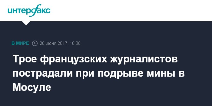Москва. 19 июня. INTERFAX.RU - Трое французских журналистов получили ранения в результате подрыва на мине в иракском Мосуле, сообщила в понедельник газета Le Figaro. Курдский журналист Бахтияр Аддад, который сотрудничал с рядом западных СМИ, включая France Televisions, погиб.