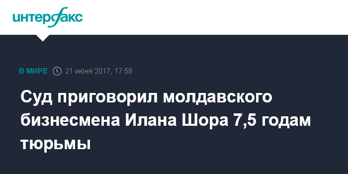 Москва. 21 июня. INTERFAX.RU - Известный молдавский бизнесмен Илан Шор, супруг певицы Жасмин, приговорен к 7,5 годам лишения свободы, такое решение вынес в среду суд Кишинева.