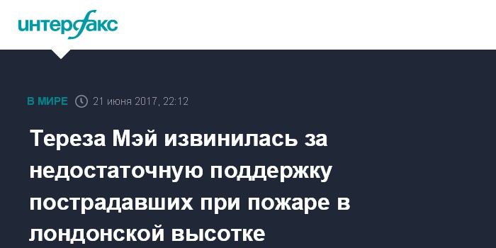 Москва. 21 июня. INTERFAX.RU - Премьер-министр Великобритании Тереза Мэй принесла извинения за "недостаточно хорошую" поддержку со стороны правительства пострадавшим после пожара в жилой высотке Grenfell Tower в Лондоне, сообщает в среду агентство Associared Press.