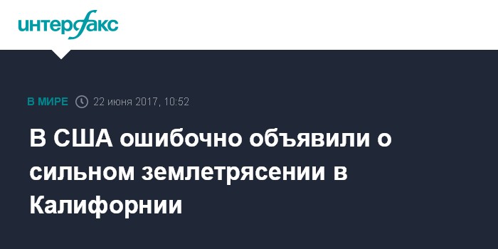 Москва. 22 июня. INTERFAX.RU - Геологическая служба США по ошибке сообщила о землетрясении в штате Калифорния, передает в четверг агентство AP.