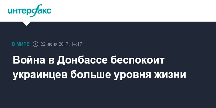 Москва. 22 июня. INTERFAX.RU - Война в Донбассе беспокоит 71,1% жителей Украины, тогда как вопрос уровня жизни - лишь 59,9%, свидетельствуют результаты социологического исследования, проведенного Киевским международным институтом социологии (КМИС) 20-29 мая.