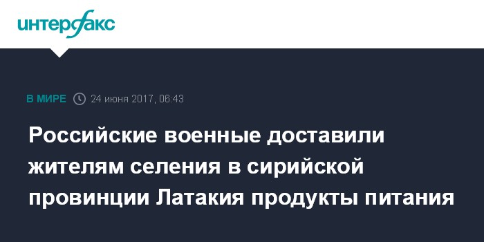 Москва. 24 июня. INTERFAX.RU - Российские военные из Центра примирения враждующих сторон в Сирийской Арабской Республике (САР) обеспечили жителей латакийского селения Аль-Серкезия продуктами питания.
