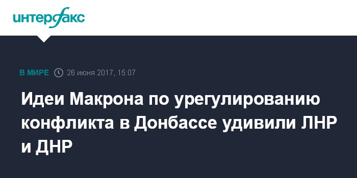 Москва. 26 июня. INTERFAX.RU - В Донецке и Луганске с недоумением восприняли предложения президента Франции по урегулированию вооруженного конфликта в Донбассе, которое украинский президент Петр Порошенко назвал "формулой Макрона".