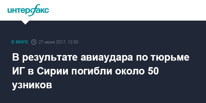 Москва. 27 июня. INTERFAX.RU - Авиаудар, нанесенный по удерживаемой террористами из группировки ИГ (запрещена в РФ) тюрьме на востоке Сирии, привел к гибели минимум 42 узников. Об этом сообщает во вторник агентство The Associated Press со ссылкой на очевидцев.