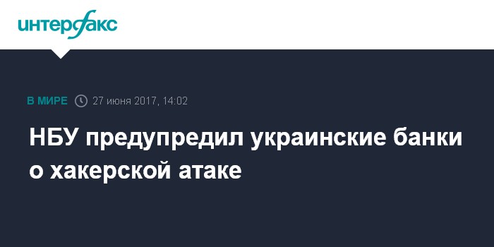 Москва. 27 июня. INTERFAX.RU - Национальный банк Украины предупредил банки и других участников финансового сектора об осуществляемой во вторник внешней хакерской атаке неизвестным вирусом на несколько украинских банков, а также некоторые предприятия коммерческого и государственного секторов.