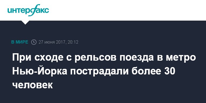 Москва. 27 июня. INTERFAX.RU - По меньшей мере 34 человека получили травмы в метро Нью-Йорка из-за схода поезда с рельсов, сообщил во вторник американский телеканал Fox News.