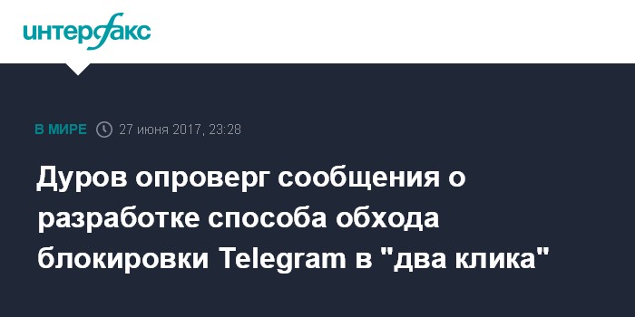 Москва. 27 июня. INTERFAX.RU - Владелец Telegram Павел Дуров опроверг сообщения о том, что команда мессенджера разрабатывает способы обхода его блокировки в "два клика".