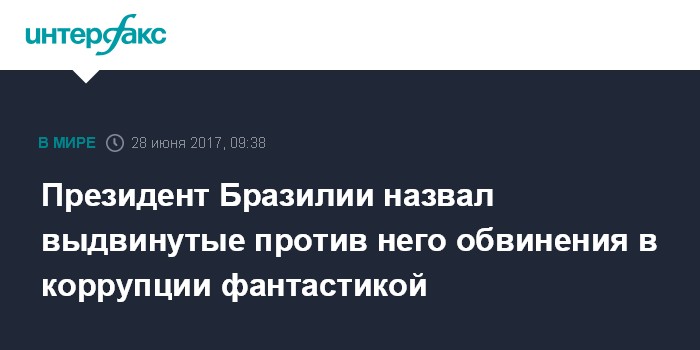 Москва. 28 июня. INTERFAX.RU - Президент Бразилии Мишел Темер отрицает выдвинутые против него обвинения в коррупции и называет их фантастикой, сообщает в среду Jornal Nacional.